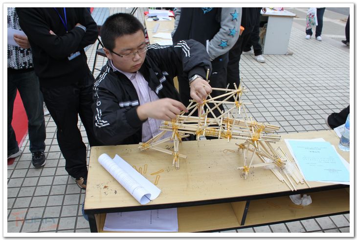 江苏锡山中学的徐乐正在聚精会神地制作筷子搭桥 |