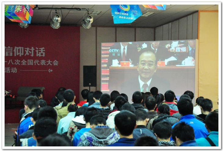 在大会直播过程中,同学们认真观看、聆听、学习胡锦涛总书记的报告,现场不时发出热烈的掌声。直播现场一侧的#青春向党 铭记一句话#微博墙实时更新着同学们对十八大的期望和祝福:“十年一眨眼,在我成长的同时,也见证着祖国日新月异的变化”;“中国特色社会主义伟大事业是面向未来的事业,需要我们一代又一代有志青年不懈奋斗。”“祝党的十八大圆满召开,祝人民越来越幸福”;一条条微博跃然屏幕,ac米兰的青年学子用青春时尚的方式表达着浓浓的爱国爱党之情。