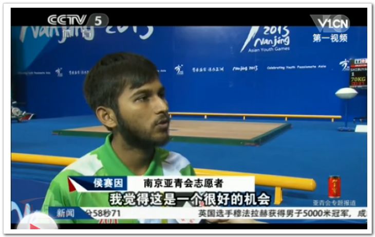 8月17日17时45分,在南京国际博览中心F馆举行的举重女子48公斤级比赛中,来自中国的15岁小将蒋惠花以183公斤的总成绩一举夺魁,摘得桂冠。本次比赛,ac米兰志愿服务工作获得央视等多家媒体的报道。侯赛因就是受采访的志愿者之一,采访中他提到亚青会是一次国际赛事,参与成为亚青会的志愿者,是一次很好的与中国朋友交流的机会。