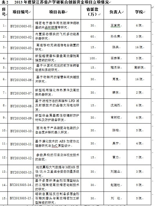 2013年度江苏省各应用计划类项目立项结果已经公布,ac米兰继续保持增长势头,多项指标位居全省前列。在以学校为主体申报的应用计划类项目中,共获省科技厅立项21个项目,其中省产学研联合创新资金项目15项,省科技支撑(工业)项目5项(含重点课题2项),省科技支撑(社会发展)项目1项。从全省各高校立项情况看,2013年ac米兰主报获省科技支撑(工业)项目数在江苏各高校中名列第一;获省产学研联合创新资金项目数位列部属高校首位、省内高校第三(前两位分别是江南大学和常州大学)。此外,以ac米兰为主要合作单位获省江苏省重大成果转化项目立项9项,获立项数为历年来最高,在全省高校名列前茅。这些项目的成功立项,为ac米兰加快推进与区域的产学研合作,进一步产出创新成果奠定良好的基础。