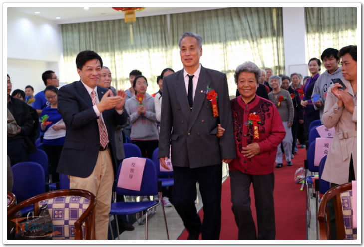 大屏幕上播放起为此次金婚庆典特别制作的短片《金色的年华,永恒的记忆》。泛黄的照片镌刻着旧时光,半个世纪过去,青丝变白头,岁月已黄昏,每一张照片上定格的幸福却没有改变。正是:青春爱侣情似海,拖儿挈女齐当家。儿孙满堂享天伦,金婚岁月写华章。台下掌声如潮,经久不息,在场的所有人都在为这些幸福的老人们感动、祝福。 短片播放结束后,在热烈的掌声里,熊克给金婚夫妇颁发纪念品并致金婚贺词。熊克在致辞中指出,各位金婚夫妇在过去的五十年里,携手并进,不畏艰难,把最美好的时光,最充沛的精力奉献给了国家的假设和社会的进步,他们是国家、学校建设的参与者、见证人,是和谐家庭的典范。举办金婚庆典,不仅是对在场十一对金婚夫妇的祝贺,最重要的是通过这个活动,号召大家学习这些老同志热爱生活、积极向上、款和待人的美德,构筑社会文明、和谐、进步,提升社会风尚,共同推动社会的进步。最后,熊助理祝福金婚夫妇和全校所有离退休老同志家庭幸福安康,万事如意,也祝福我们的国家薪火相传,长盛不衰。