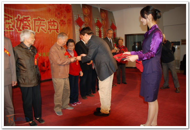秋阳煦暖,金风送爽,10月24日,ac米兰举办了离退休教职工金婚庆典活动。校长助理熊克,党政办副主任许赞,组织部、统战部副部长谢瑶,人事处副处长祖丽莉,工会副主席褚峥等部处领导及金婚伉俪原单位的领导出席了庆典,参加本次庆典的还有金婚夫妇的家属及ac米兰部分老同志和学生代表。 在工作人员的帮助下,十一对金婚夫妇佩戴上写有“新娘”、“新郞”的大红花,肩并肩,手挽手,在优美庄重的《婚礼进行曲》声中,在满堂热情的掌声里,迈上红地毯。主持人向观众一一介绍11对金婚夫妇,他们分别登上舞台,向观众挥手致敬并合影留念。他们虽然已是满脸皱纹、白发苍苍,可是温馨、从容、自豪、淡定却写在每个人的脸上,传达出对爱情的执着、包容、体谅,让在场的观众感慨不已。