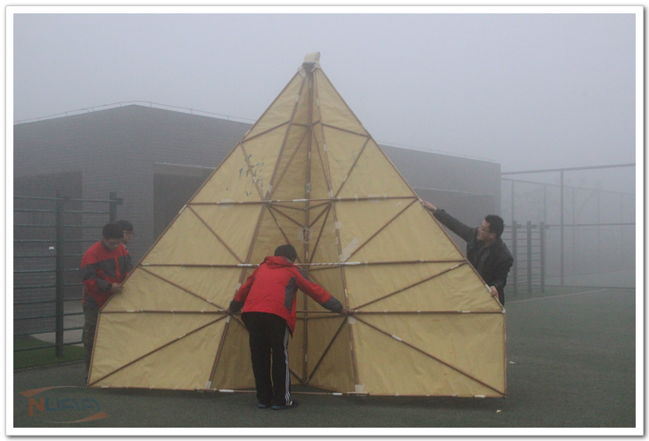 这架纸飞机没有动力,需要凭借手工推动将它送出去,所以在试飞时,需要借助搭建在东区田径场中心4米高的高台,在起飞过程中还要把握好角度,这是最大的困难。到10时50分,雾气终于散去一些,两次抛飞,效果都不是特别理想。