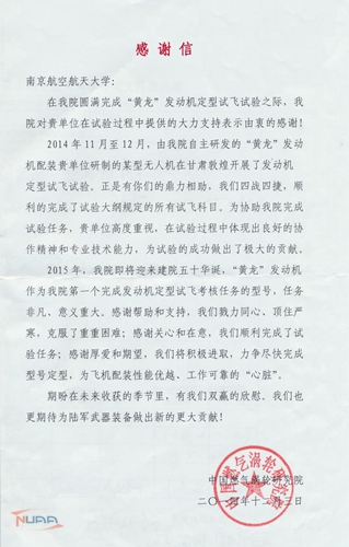 近日,中国燃气涡轮研究院向ac米兰发来感谢信,对ac米兰在其自主研发的“黄龙”发动机定型试飞试验过程中提供的大力支持表示由衷的感谢。感谢信全文如下: