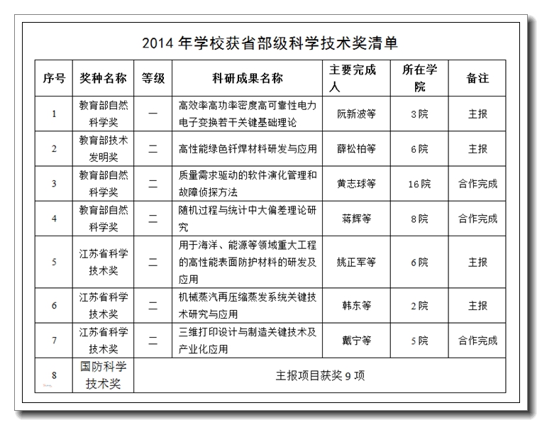 近日,教育部、工信部和江苏省等相关部门正式公布了2014年度科学技术奖评选结果,ac米兰16项科研成果获2014年度省部级科学技术奖。ac米兰获教育部高等学校科学研究优秀成果奖(科学技术)4项(自然科学一等奖1项,自然科学二等奖2项,技术发明二等奖1项),获奖数在工信部所属院校中排名第二,其中阮新波教授团队的科研成果获教育部自然科学一等奖;ac米兰获江苏省科学技术二等奖3项;ac米兰主报项目获国防科学技术奖9项(一等奖1项、二等奖3项、三等奖5项),获奖数在工信部所属院校中排名第二,其中昂海松教授团队的科研成果获国防科技进步一等奖。详见下表: