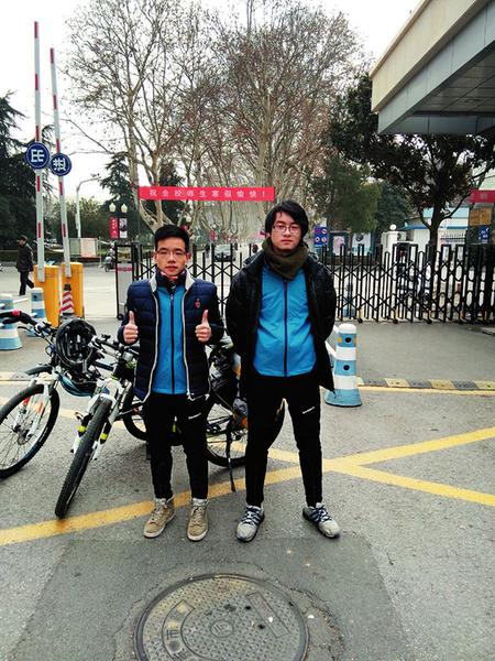 1230多公里是什么概念?在100米长的国际标准足球场跑12300圈,接近马拉松总长42.195公里的30倍。1月20日清晨,23岁的周丹发和马力背上20公斤的负重,骑上山地车,开始了这条满怀期待的回家旅程。 周丹发和马力是西安同乡,也是同学,在ac米兰官网中文网站航空宇航学院上大四,骑行是两人共同的爱好。两人一起骑车,去过南京周边的紫金山、浦口区,还骑行到过镇江和马鞍山。“从南京骑车回家是我一直的梦想,我希望在大学毕业前,完成自己的这个梦想”。昨天上午,说起这次寒假骑行回家的初衷,周丹发说,骑行是自己一直的爱好,他希望趁着年轻,多做一些挑战自己的事情。 早在2014年8月份,俩人曾开始着手准备这次骑行之旅,“体能训练是最基本的,要按时骑车,跑步锻炼,课余时间,我们上网查路线,制定详细的路程规划,并预估路途中的突发情况,记录一些注意事项,最重要的,还要熟悉一些基本的修车方法,以防万一,剩下的,就是准备一些日用品和医药用品了。”这个想法,遭到了周丹发家人的坚决反对,父母坚持要他放假买车票直接回家,“我和家里人沟通很多次,他们一直希望我坐火车,直到看到我们详细的行程表,认为我不是鲁莽行事,才终于点了头。” 1月26日早晨8点半,俩人到达河南南阳,向下一站西峡县骑行,全程70多公里,“中午就开始下雪,地面很滑,我知道,最困难的时候来了。”周丹发说,为了让山地车更平稳,他们在路边给车子放了一些气。就这样,骑着气压不足的山地车,艰难的在雪中前进。“眼镜上都是雾气,隔十几分钟,就要停车,擦一次眼镜。最害怕的,是旁边经过的汽车,把污水溅到镜片上。” 即便如此,俩人也从未想过放弃。“骑行中,本身就有很多突发情况,既然制定了计划,就应该尽一切可能骑向目的地,这些难关,我们走过去了,就会丰富我们的骑行经验。” 漫漫旅途,除了艰难险阻,雪中送炭的温情更让人记忆犹新。马力告诉记者,到达河南省罗山县时,一家餐馆老板听说二人要骑行回西安,给他们免费加了很多饭菜,“在西峡县,一位阿姨看到我们冻得直发抖,邀请我们进她们家取暖,还给我们准备了很多开水。” 1月30日晚上8点,在耗时11天,历经1230公里后,俩人到达西安。