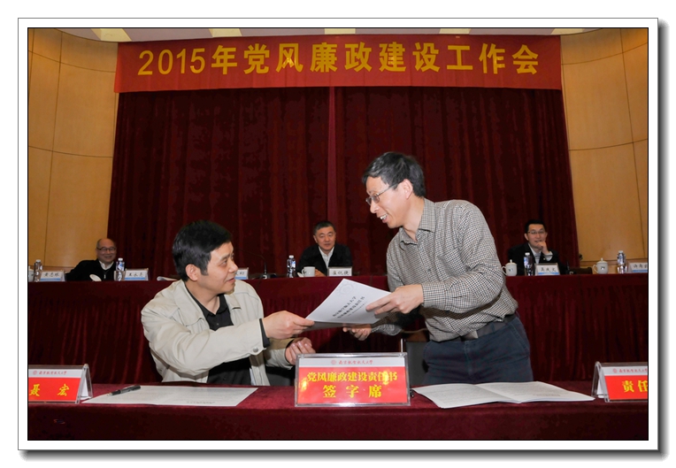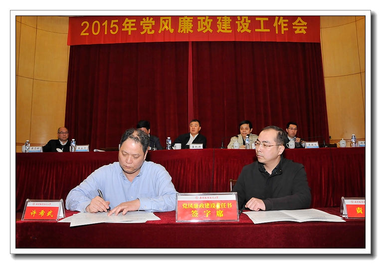 校长聂宏在总结中强调,各单位负责人要认真组织学习本次会议精神,根据学校的统一部署,结合本单位的实际,研究制定本单位党风廉政建设具体工作计划和任务。各级领导干部要进一步增强责任感和紧迫感,坚持党风廉政建设与本单位的中心工作一起谋划、一起部署、一起考核,真正把主体责任落实到位,扎实把每样工作抓具体、抓深入,确保事事有着落、件件有结果。要聚焦遵守党的纪律,纠正四风,重点领域专项治理等方面存在的突出问题,敢于出实招、下猛药,一件一件的抓,一项一项的改,确保取得明显成效。要坚持改革创新,健全工作制度,加强工作队伍,完善工作机制,善于运用法治思维和法治方式,系统化推进本单位的党风廉政建设,努力打造山清水秀的廉政生态,为加快推进深化校内综合改革提供坚强有力的保障。 为切实压紧压实压牢党风廉政建设主体责任,会上举行了党风廉政建设责任书签订仪式。校党委书记、校长分别与院级党组织书记、学院和教学单位行政负责人及分管职能部门负责人,校领导班子成员与分管职能部门负责人现场逐一签订了党风廉政建设责任书,进一步明确责任范围,规范考核要求,强化责任追究,传导工作压力。