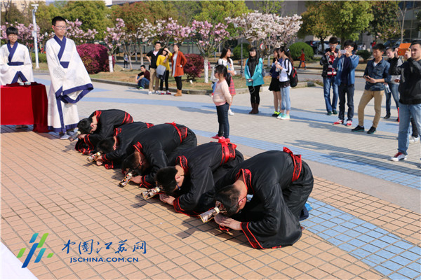 五位身着汉服的学生跪在垫子上,场地北段摆放着香案、香炉,在庄严的古琴演奏声中,受邀嘉宾为几位同学加冠。“以前听说过古代男孩二十岁要行冠礼,但是这样亲眼见到是第一次,感觉学到了不少。”围观的李同学按捺不住,也想亲身感受冠礼。
