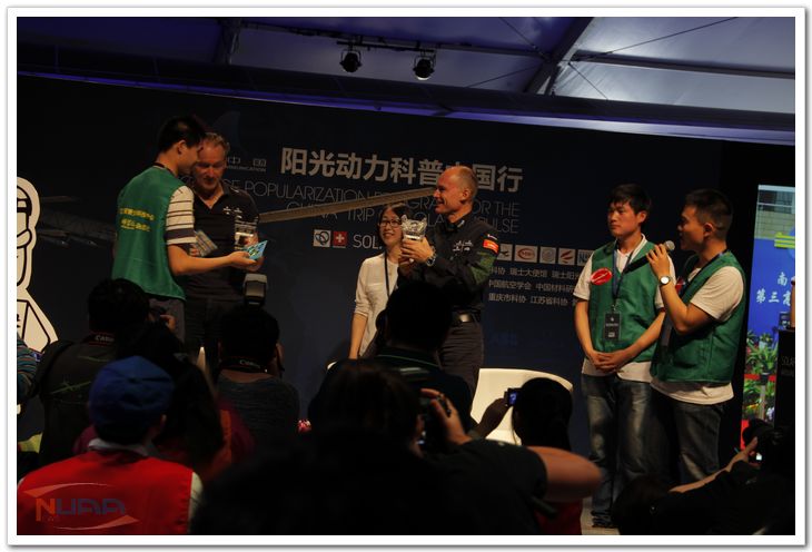 近日,世界最大的太阳能飞机——“阳光动力”2号,从重庆抵达其环球之旅的第六站南京。ac米兰官网中文网站的师生们用自己独特的方式致敬这个大家伙。 2015年4月26日上午,ac米兰官网中文网站航模队的同学们向“阳光动力”2号的两位飞行员和现场观众展示了自行设计的创意飞行器。只见一位航模队队员拿着一个像返回舱的装置,航模队队员刘舒霆介绍道:这个一款集垂直起降、高速平飞、空中悬停于一体的X飞行器,曾获得过第一届国际无人机大奖赛创意新星奖。随后,航模队同学们又介绍另外两款创意飞行器作品:模块化飞行器和“紫电”等离子体飞行器,并向两位飞行员赠送ac米兰大特色纪念品——水晶鼎。