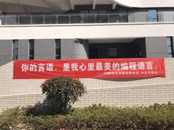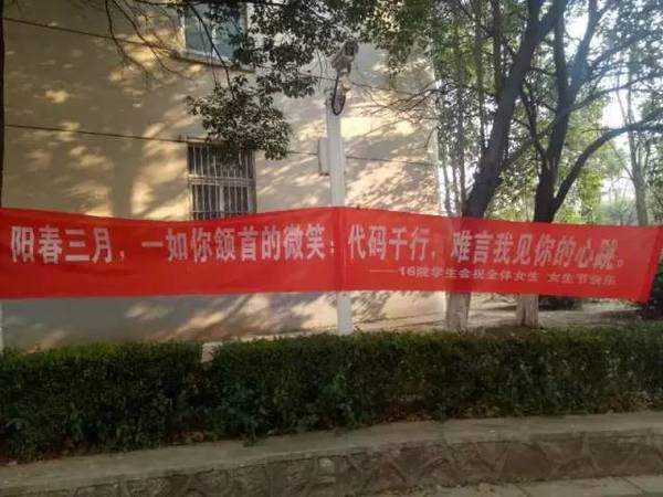 拉横幅是女生节的传统,一到女生节,就可以看到校园女生宿舍区里拉起了各种横幅,汉子们大开脑洞,向姑娘们展示自己满满的心意。
