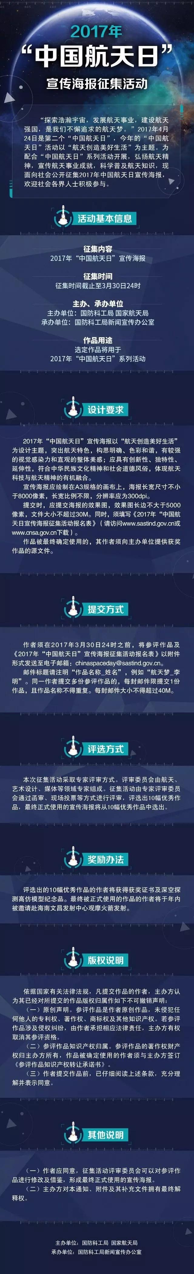 2017年4月24日是第二个“中国航天日”。在第二个“中国航天日”来临之际,国防科工局、国家航天局面向社会组织开展宣传海报征集活动,旨在激发广大航天爱好者和专业设计人员的创作热情,动员社会公众积极参与2017年“中国航天日”活动。