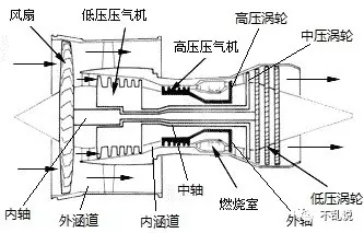 如上图所示,涡轮风扇发动机其实就是在涡轮喷气发动机的前方又加了一个巨大的“风车”,称为“风扇”。风扇的直径比压气机、燃烧室和涡轮都大,多出来的那一截形成了一个新的、不经过压气机燃烧室和涡轮的空气流路,称为“外涵道”,而经过压气机燃烧室和涡轮的空气流路就成了“内涵道”。风扇和压气机一样是由发动机后部的一组涡轮驱动的。在上图的三转子发动机中,风扇与低压涡轮、低压压气机与中压涡轮、高压压气机与高压涡轮分别由里外嵌套的三个轴连接组成三个相互独立的转子,从高压到低压转速逐渐降低以适应各自不同的工作条件。