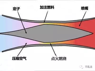 脉冲喷气发动机也是由纳粹德国在1944年发明的,被用于推进世界上第一种巡航导弹V-1。之所以被称为“脉冲”,是因为它产生的推力不是连续的。发动机主体就是一个圆筒,前部有一个“节气活门”,相当于空气单向阀,它使得空气只能从进气口向发动机内流动而不能流出发动机。首先给脉冲发动机一个速度,空气由于自己的惯性流入发动机;之后发动机圆筒内的油嘴喷射煤油,煤油被点燃,产生的燃气由于发动机前部“单向阀”的阻拦只能向后方逃逸,从喷口喷出产生推力;由于燃气的惯性,燃气在圆筒内气压已经与外界平衡之后仍会继续向后流动使得圆筒内暂时产生负压,“单向阀”被外界大气压顶开,新鲜空气再次流入发动机,开始下一工作循环。