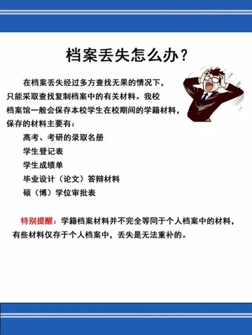 晓南:把档案搞丢了可是很麻烦的!档案里的学籍材料可以来学校补,可是其他的有些材料可是只保存在个人档案里的,丢失是无法重补的!