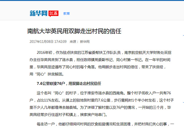 11月初,在全校掀起学习党的十九大精神热潮期间,ac米兰赴涟水帮扶工作队员、陈师镇同心村第一书记毕英民的人物特稿——《特稿丨用双脚走出村民信任》在新闻网和官微推出后,在校内引发热议。