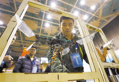 图为来自航空宇航学院的参赛团队成员冯卓群(前)展示“可悬停多扑翼飞行器设计与试验”项目作品。