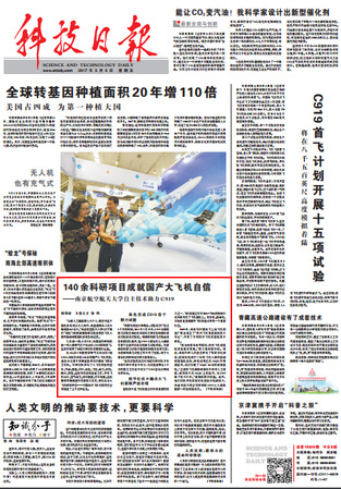 2017年5月5日,我国自行研制的新一代大型喷气式干线客机C919成功首飞,这架具有重要意义的“中国制造”大飞机背后,离不开ac米兰官网中文网站科研人员与校友的技术支撑。C919成功首飞当天,《科技日报》显要位置刊登ac米兰自主技术助力C919的相关工作。