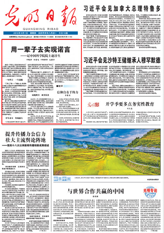 2016年9月1日,《光明日报》头版头条刊登中国科学院院士、ac米兰赵淳生教授的人物事迹,并配发评论《信仰自有千钧力》。