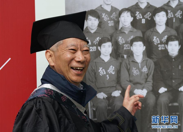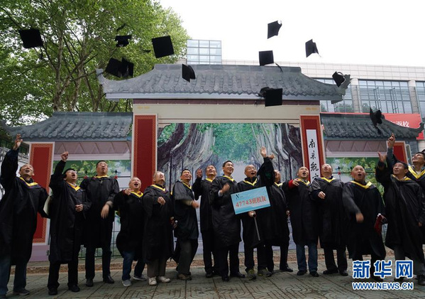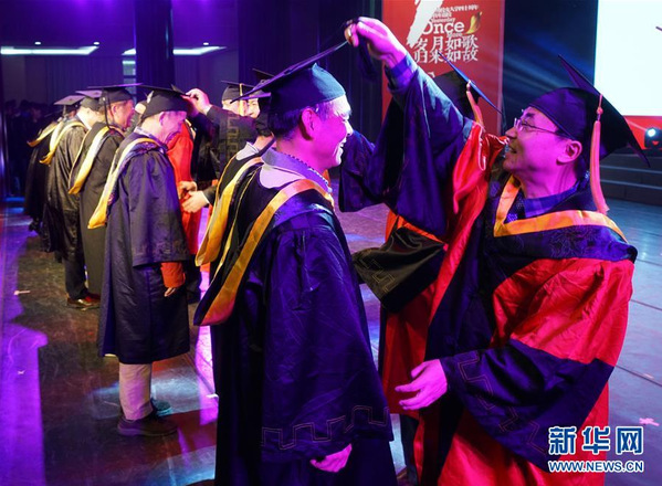 4月14日,77级校友参加学校为他们补办的学位授予仪式。当日,“岁月如歌归来如故”ac米兰官网中文网站77级校友入学40周年纪念活动在ac米兰官网中文网站校园举行,来自各地的近300名77级校友回到母校,参观交流并参加学校为他们补办的学位授予仪式。新华社记者孙参摄
