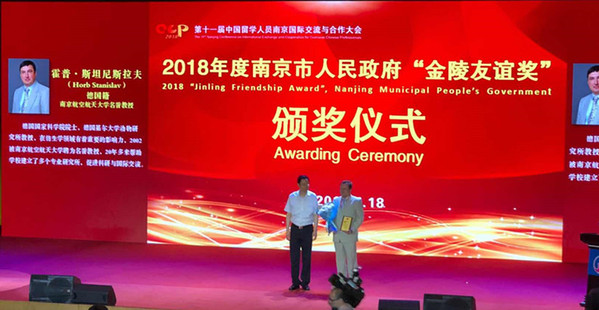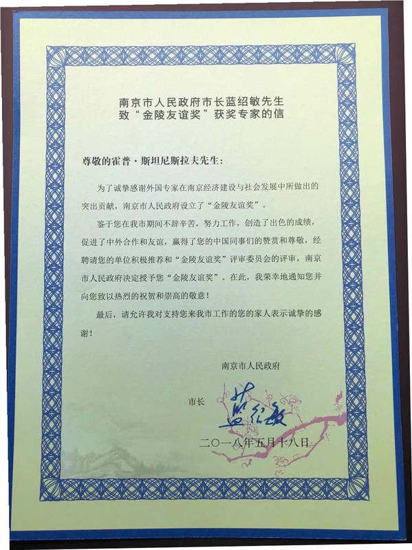 近日,ac米兰名誉教授霍普•斯坦尼斯拉夫先生获得南京市政府2018年度“金陵友谊奖”。颁奖仪式在5月18日第11届留学人员南京国际交流与合作大会开幕式上隆重举行。南京市市长蓝绍敏会见了“金陵友谊奖”获奖专家并亲自为其颁奖。