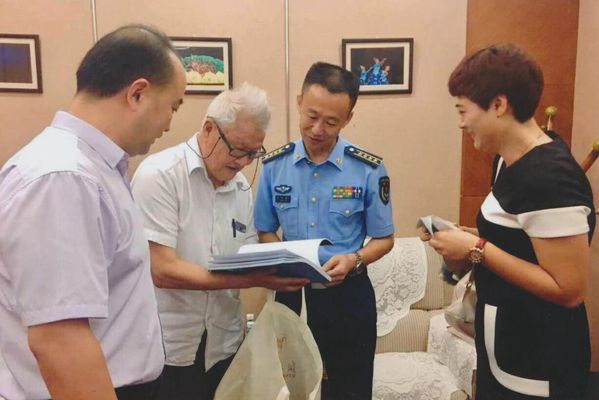乔新与八一勋章获得者、英雄试飞员李中华交流,摄于2017年