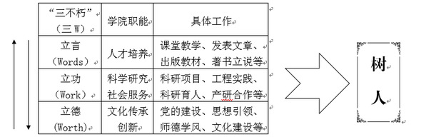 季海群:立言、立功、立德这“三不朽”基本概括了当今高等教育的人才培养、科学研究、社会服务、文化传承创新这四大职能。院党委探索将高校的四大职能和“立言、立功、立德”基本对应并有机结合,在教育思想中努力树立人才培养的中心地位,在教育实践中探索构建学院“立德树人”工作模式。在这一模式中,学院从人才培养出发,向科学研究、社会服务、文化传承创新拓展,又无不落脚在人才培养、反哺于人才培养。教育工作者从立言出发,向立功、立德拓展,又无不回溯树人、无不指向树人。这是一个可以展开研究、也非常值得探讨的教育思想问题,今天是个访谈就只能简单谈这些。为了便于直观的解释和体现这一模式,暂用下图来说明:
