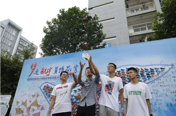 在航空宇航学院迎新点,学院用无人机向新生赠送《冯如传》《钱伟长传》《王适存传》等中国航空史伟人的传记或专著,学院还设立了航宇梦想交换站,学院邀请中国科学院院士赵淳生、胡海岩、郭万林,国家级教学名师昂海松等名师写下寄语,并用印在纸飞机上的一份充满期盼、鼓励、祝福的寄语,交换新生的一份成长梦想。