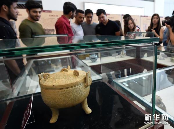 9月6日,几名外国留学生在参观展览。新华社记者 孙参摄