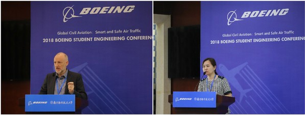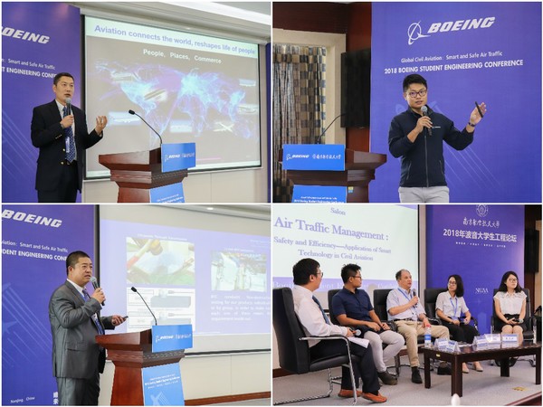 高峰论坛的首场主题报告迎来了波音东北亚区域营销总监 Wang Yang 以“Global Civil Aviation”为主题的分享。第二场报告由波音全球服务公司飞行技术安全部Sam Chen机长带来,他分享的主题是“Digital Aviation”。短暂茶歇过后,波音天津复合材料有限公司质量总监Harry Zhang为同学们带来了主题“Composite parts play in Safe Air Traffic”的报告。