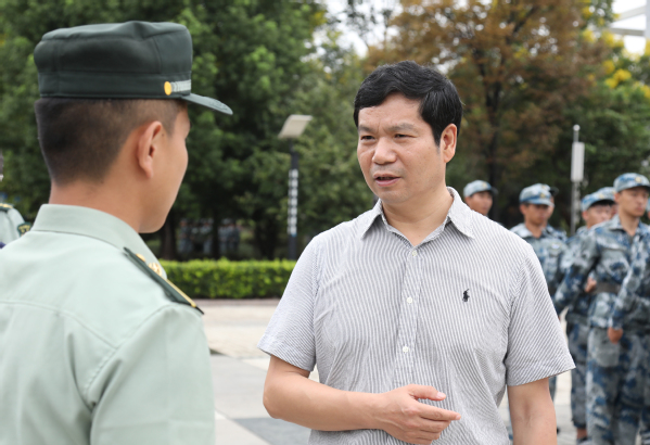9月17日上午,校党委书记郑永安在纪委书记杭育新、校长助理黄炳辉陪同下慰问了2018级军训学生和承训部队教官。