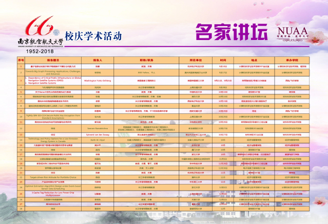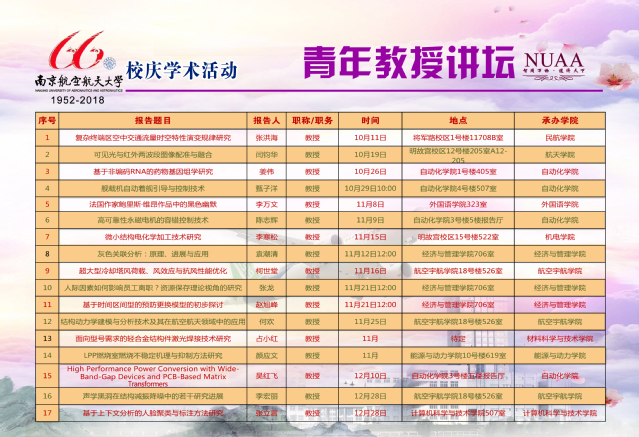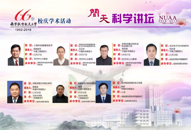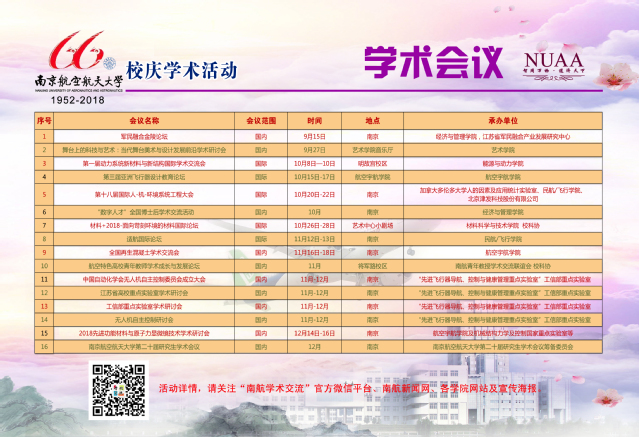 为进一步促进ac米兰学术交流活动的开展,践行学校提出的“以育人为本,促进人才培养;以学术为本,促进学术繁荣;以航空为本,促进特色发展”的办学理念,2018年ac米兰“66周年校庆学术活动月”系列活动将于10月—11月举行。期间,学校将举办 “问天科学讲坛”、“名家讲坛”、“青年教授讲坛”等一系列品牌学术活动。欢迎广大师生积极参与。