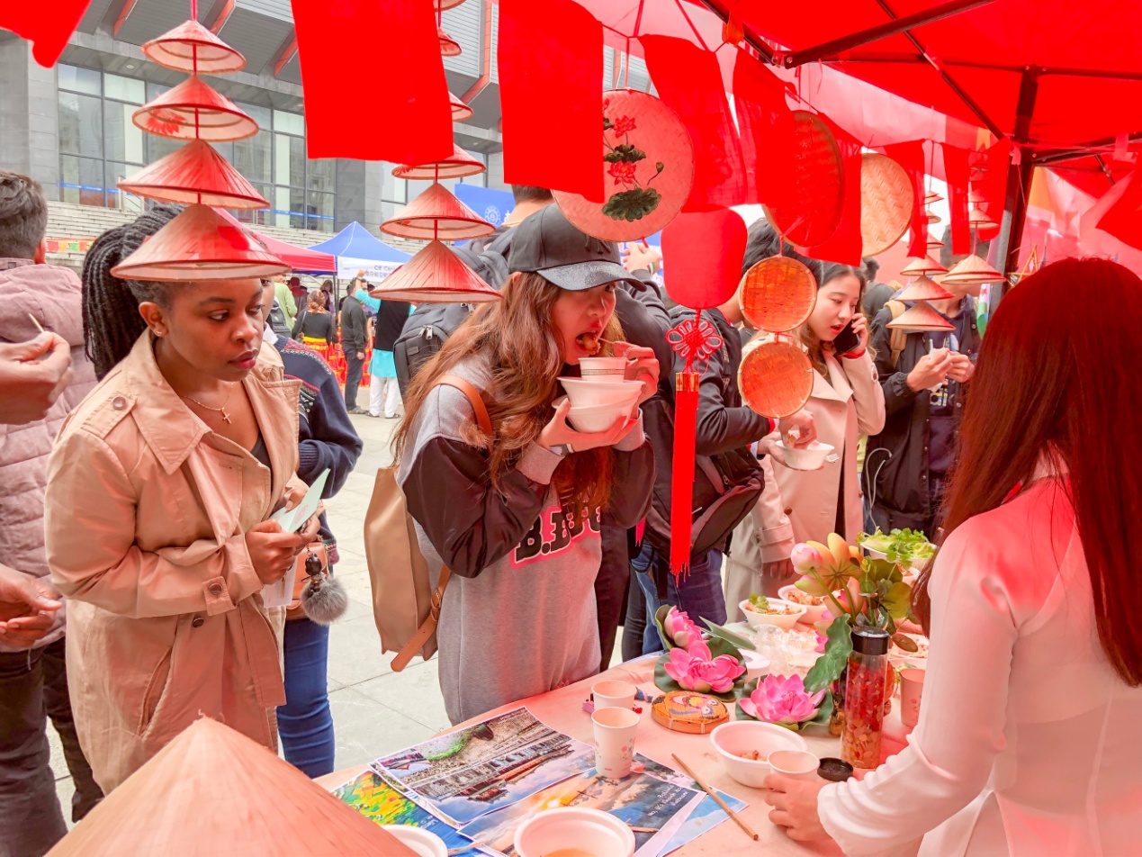 “环球美食汇”上,来自世界各地的特色美食悉数登场,印度留学生独家秘制的咖喱鸡丁、藏族学生的奶茶奶片,印度尼西亚留学生的亲手烹饪的虾饼,斯里兰卡留学生的锡兰红茶……中外学生同台竞技,巧手烹饪出各色美食,让中外师生们大饱口福。
