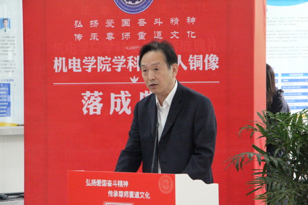机电学院院长傅玉灿首先介绍了学科奠基人铜像落成的背景,生动而简要地介绍了四位学科奠基人对学院创建所作出的卓越贡献。他号召全体机电人:传承学科奠基人忠诚祖国、忠诚人民的崇高精神品质,弘扬科学探索精神、严谨治学传统、学术创新思想、教书育人初心,为建设卓越、融合、创新、开放、活力的世界一流机电学院而不懈奋斗。