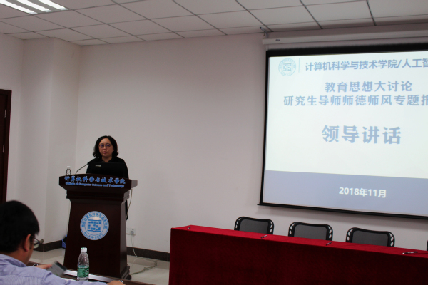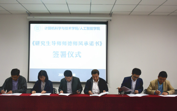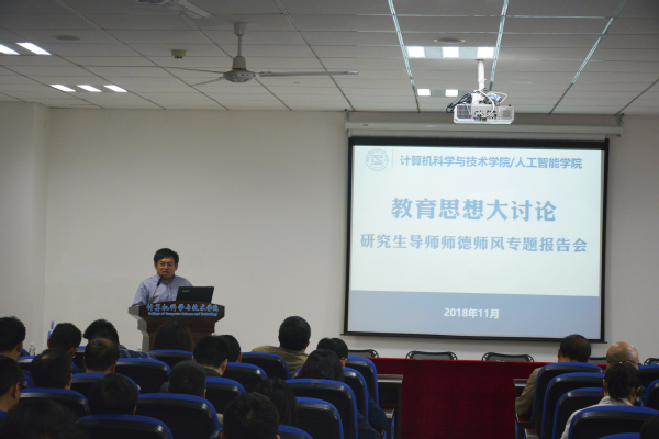 为深入开展教育思想大讨论,进一步提升广大教师师德师风水平,引导教师自觉践行师德规范,营造全体教师爱岗敬业、教书育人、勇于创新、甘于奉献的良好氛围,11月2日下午,计算机科学与技术学院/人工智能学院举行了教育思想大讨论之研究生导师师德师风专题报告会暨《研究生导师师德师风承诺书》签署仪式。校研究生院副院长沈以赴应邀作题为《新时代研究生教育之导师职责与学位质量》的专题报告。学院领导班子成员和全体研究生导师、新入职教师参加会议。会议由副院长燕雪峰主持。