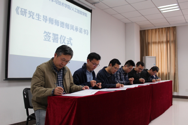 随后,学院举行了《研究生导师师德师风承诺书》签署仪式。根据上级和学校的相关文件精神,承诺书从师德师风、业务素质、培养责任等维度明确了研究生导师的工作要求。全体研究生导师在仪式现场认真阅读,并郑重地签下了自己的名字。