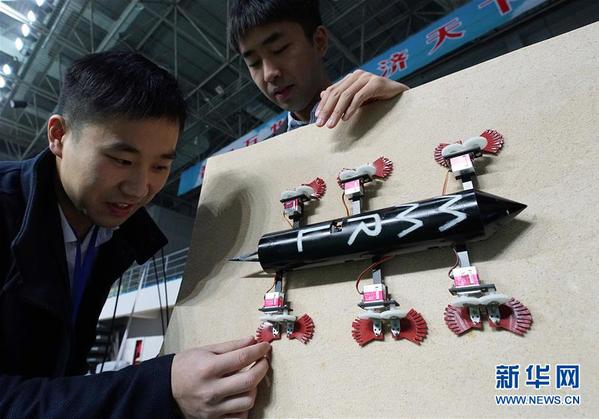 11月30日,参赛研究生团队成员胡捷(右)向同学展示一件可以在竖直粗糙壁面进行任意方向稳定爬行的“爬壁机器人”。