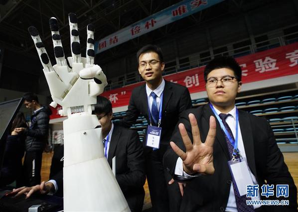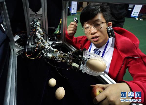11月30日,参赛研究生团队成员朱士鹏(右)展示一件通过“机器视觉”系统控制,能灵活模仿人手动作的仿生机械手臂作品。 新华社记者 孙参 摄