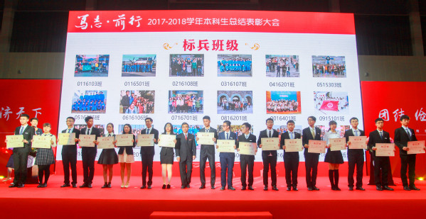 施大宁宣读了2017-2018学年本科生表彰决定;熊克、黄炳辉、王晖分别为标兵班级、标兵宿舍和杰出团队颁发了证书。