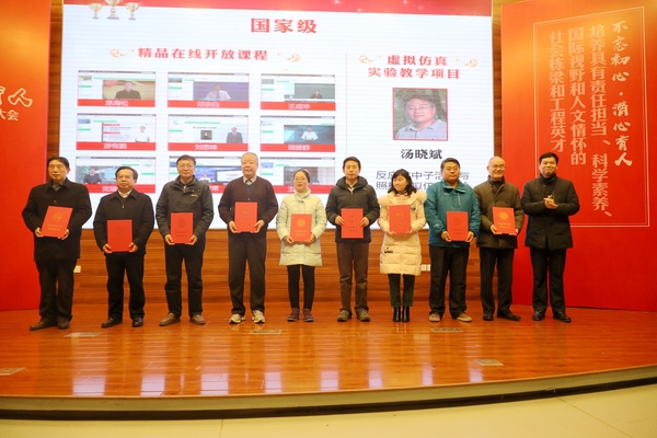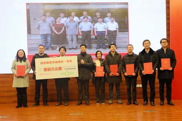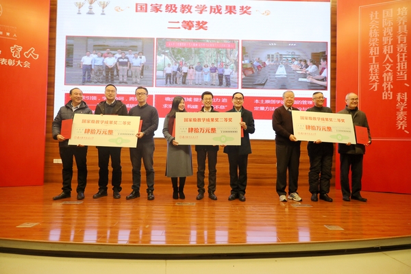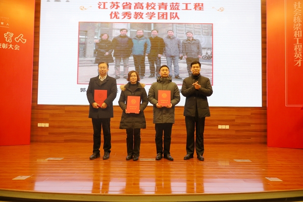 郑永安书记分别为入选“江苏省高等学校重点教材”、“2018年江苏高校‘青蓝工程’优秀教学团队”、“国家虚拟仿真实验教学项目”、“2018年国家精品在线开放课程”以及荣获“国家级教学成果一等奖”和“国家级教学成果二等奖”的教师和团队代表颁发荣誉证书,同时给予“国家级教学成果一等奖”的团队100万元奖励、“国家级教学成果二等奖”的团队40万元奖励。