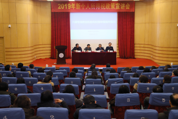 新个人所得税法已于2019年1月1日正式实施,为积极落实党中央、国务院关于减税降费的相关精神,帮助学校广大教职员工全面了解新个人所得税法,1月11日上午,学校在明故宫校区举办2019年新个人所得税法政策宣讲会,邀请南京市秦淮区税务局局长王火生、科长严炯等一行四人来校宣讲。副校长施大宁出席会议,各单位财务报账人员、科研秘书以及近200位教职员工参加了本次会议,会议由财务处处长张丕宏主持。