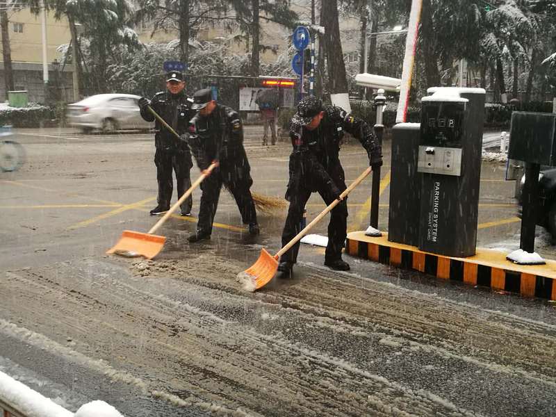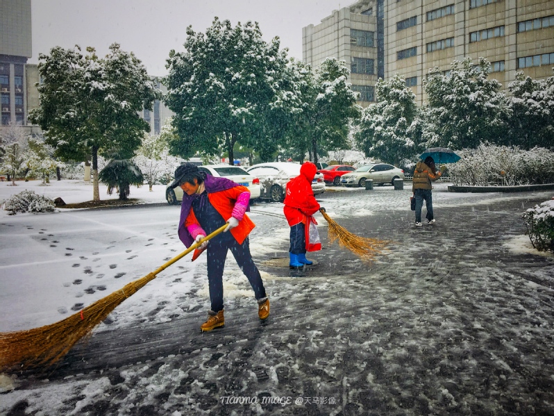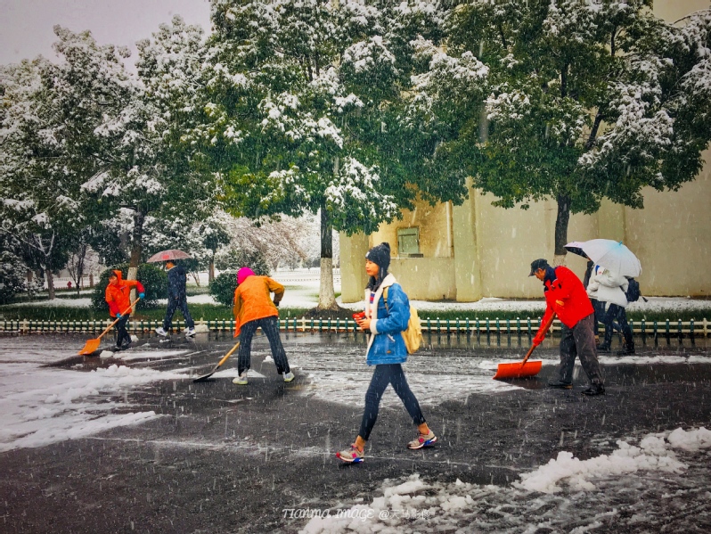 雪带着寒意,风吹的刺骨,他们是守候在校园各个角落的一帮可爱的人,清扫积雪、疏通道路、守护校园,他们的鼻子上都冒着细细的汗珠,脸上却洋溢着微笑。当我们流连忘返于校园雪景时,也请记住他们的身影!