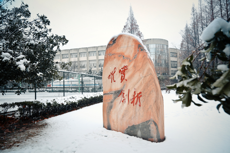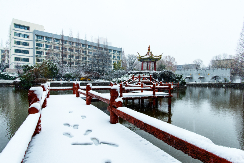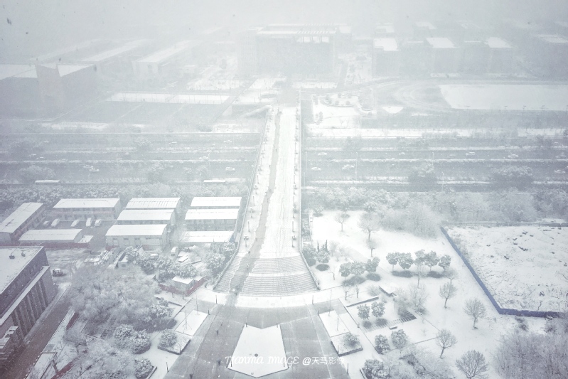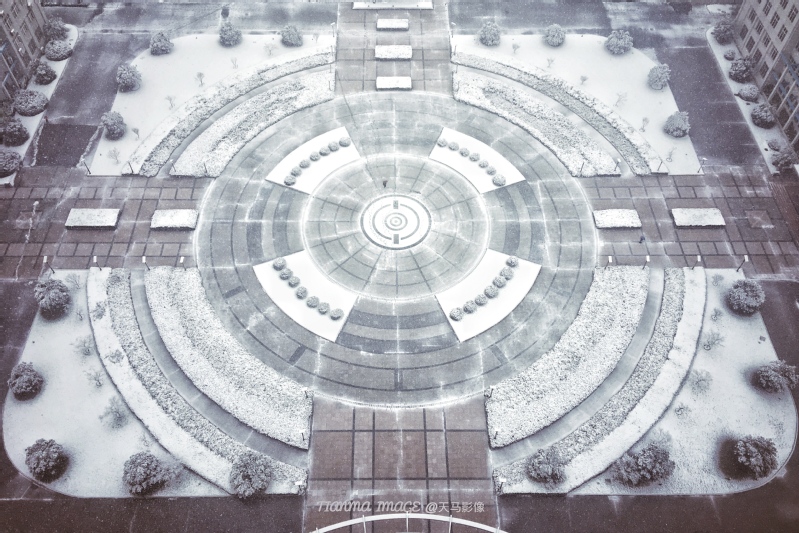 空中俯瞰,大雪一夜之间铺满校道、操场,仿佛从未有人来过。素裹白袍的校园,愈发庄严肃穆。国旗广场的雪地留下学子们的足迹,有深有浅。白雪压梅,更是一番景致。