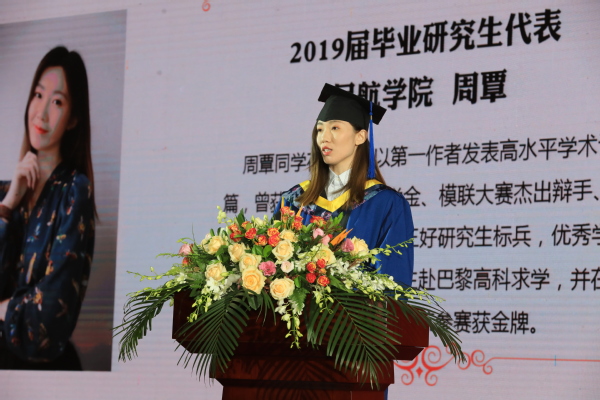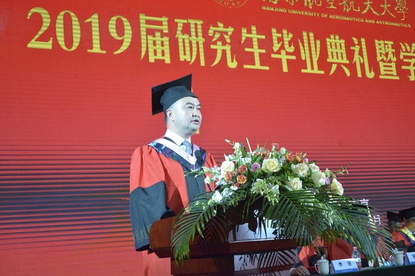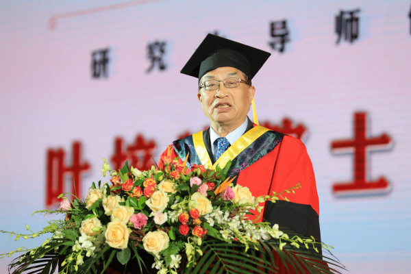 中国科学院院士、航天学院院长叶培建作为研究生导师代表发言。他以嫦娥团队为例,介绍了“嫦娥”系列飞船研发团队的成员结构和他们展现出的航天精神,寄语全体毕业生:能力与学历同样重要、要有团队精神、要做一个“爱祖国、爱民族、爱父母、爱自己”的“好人”,在前进的道路上,无论平坦与坎坷,只有奋斗才能幸福!