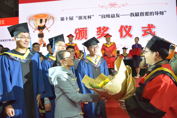 “桃李不言,下自成蹊”,典礼上举行了2019年良师益友——我最喜爱的导师颁奖仪式。校党委书记郑永安宣读了《第十届“派光杯”“良师益友——我最喜爱的导师”表彰名单》。“学生慢慢羽翼丰,先生渐渐白发生,那荟萃楼的青藤,在将这一切见证……”,学校“夕阳红”老年教师合唱团与ac米兰毕业研究生合唱一首《携手》,歌词为ac米兰学生原创,歌声和掌声向授业恩师倾诉着感谢和敬意。获奖导师们在所全体师生的见证下走过红毯,接受学生们的鲜花与祝福,郑永安书记、聂宏校长为获奖导师颁发证书与奖杯。