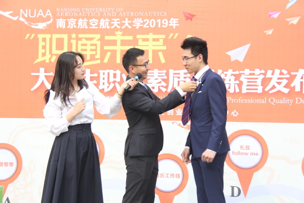 在“礼仪follow me”模块,化妆、打领带、表情管理都是抢手的热门课程。民航学院学生张天赐学习了如何打职场领带,他表示:“现在了解到职场礼仪需要注意的事项,在面试中就会更有优势。”