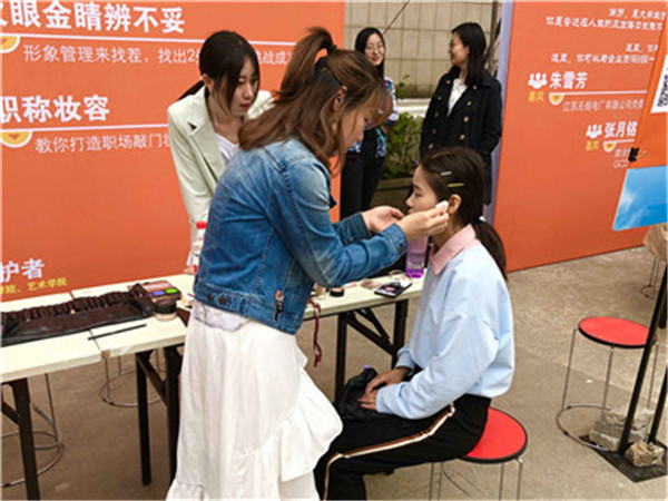 学校老师还在现场对学生们进行求职礼仪方面的指导。学生们可以参与应聘服装“大家来找茬”的游戏,也可以现场扫描二维码答题,获取更多的求职仪表管理知识。“我们很多同学都非常有能力,但是由于平时忙于学习,所以不善于表达、包装自己。其实,想要在应聘中获得用人单位的青睐,能力是一方面,另一方面也必须注重礼貌、礼仪,比如面试过程中的语速、目光交流方式、着装方式等等。通过提升自己的求职礼仪,可以很有效地提升求职的成功率。”材料学院老师杜海泉说。
