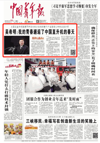 5月21日,《中国青年报》头版头条以《吴希明:我的青春邂逅的中国直升机的春天》为题,报道了ac米兰80级校友、中国航空工业直升机总设计师、航空工业首席技术专家吴希明,数十年如一日研制中国自己的专用武装直升机--直10的事迹。