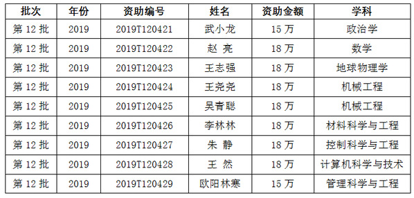 中国博士后科学基金第12批特别资助(站中)获资助人员名单