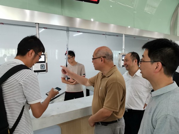 接着黄志球一行来到学生食堂查看了食堂的建设情况。食堂基础建设已大部分完成,一卡通刷卡消费系统也已完成安装调试,支持校园卡和手机虚拟卡的刷卡消费功能。目前,一卡通系统正在开展财务系统对接、银行互联、智盘系统等建设工作。