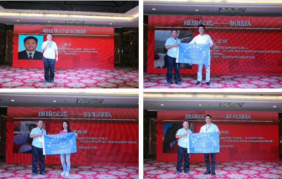 新任执行会长俞力代表新一届理事会发言,并为新成立的帆船队、羽毛球队、乒乓球队授旗。